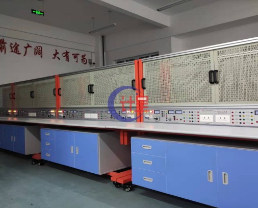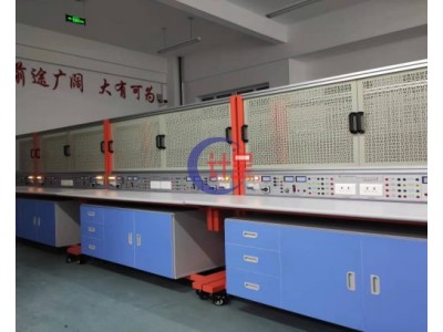 2、实训桌桌面采用25mm麻灰色高密度层压板封边特制,有效提高绝缘等级;实验桌底部装有至少4个导向轮,方便实训台架移动;