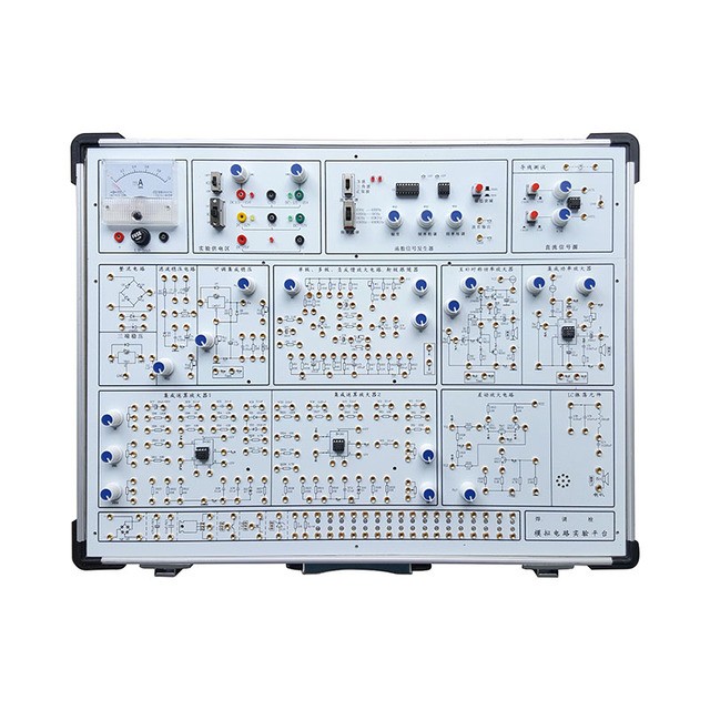 实验箱由铝木合金箱体、高性能线性电源、和实验电路板组成。其中实验电路采用固定功能模块方式,电路原理和元器件符号清晰,实验用元器件可以焊装在线路板的反面,安全可靠,不易损坏,也可以装在线路板的正面,元件直观可见,感性认识强,正面还有实验电路原理图,使学生在实验时对原理一目了然。